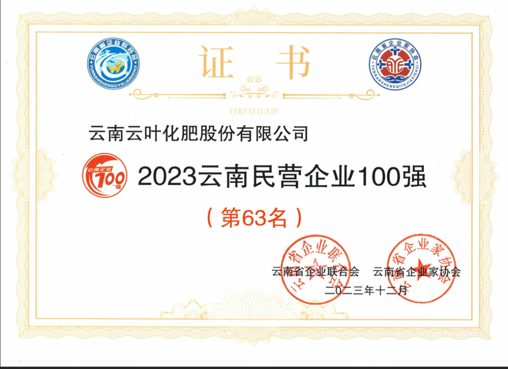 云叶被评定为“2023云南民营企业100强”第63名 2023-12-03 暂无评论 admin 资质荣誉 分享到: 上一篇: 云叶被评定为“2023云南制造业企业100强” 下一篇: 云叶被评定为“2023云南高新技术企业100强”第45名 相关文章 中国中微量元素及肥料产学研创新联盟镁肥专委会 2024全国绿色肥料影响力品牌示范单位——第十五届全国肥料“三新”研讨会牌匾 仓储中心QC小组 “无机一班”为二0二四年云南省化工行业质量信得过班组 “电工组”为二〇二四年云南省化工行业质量信得过班组 云叶被评定为“2023云南高新技术企业100强”第45名 云叶被评定为“2023云南制造业企业100强” 云南省“守合同重信用”企业 2022年度工会重点工作目标责任评定-特优单位 云南省非公企业创新能力10强(2022)第8位